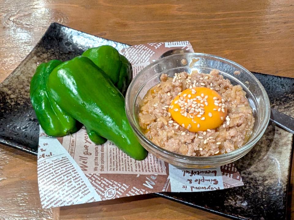 シャキッと生ピーマンを、卵黄入りの特製・肉味噌と!